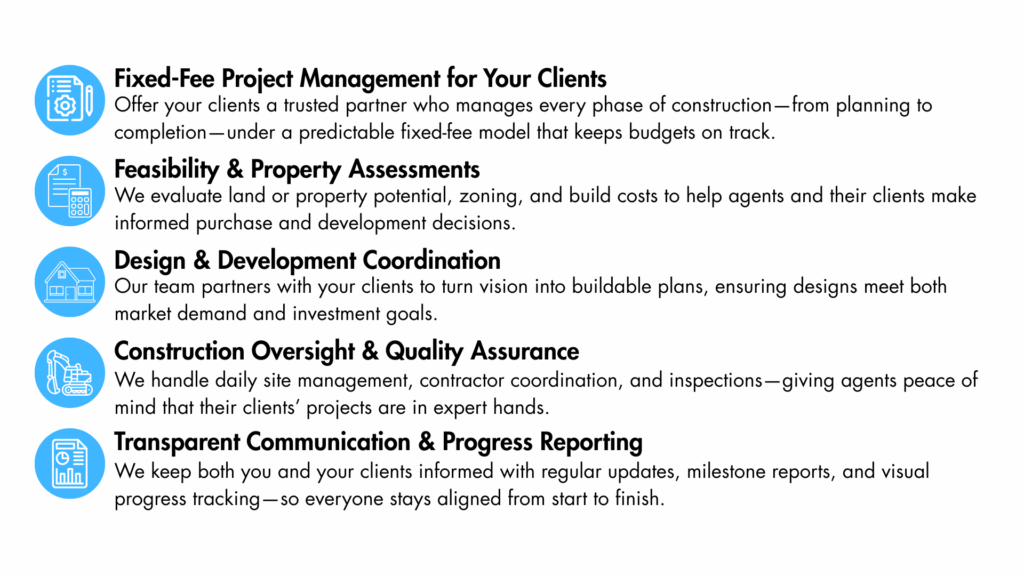 Empower your clients with expert guidance in new construction, renovations, and development projects—all managed under a fixed-fee model. Collaborate with our team to deliver seamless build solutions and strengthen your reputation as a trusted real estate professional.